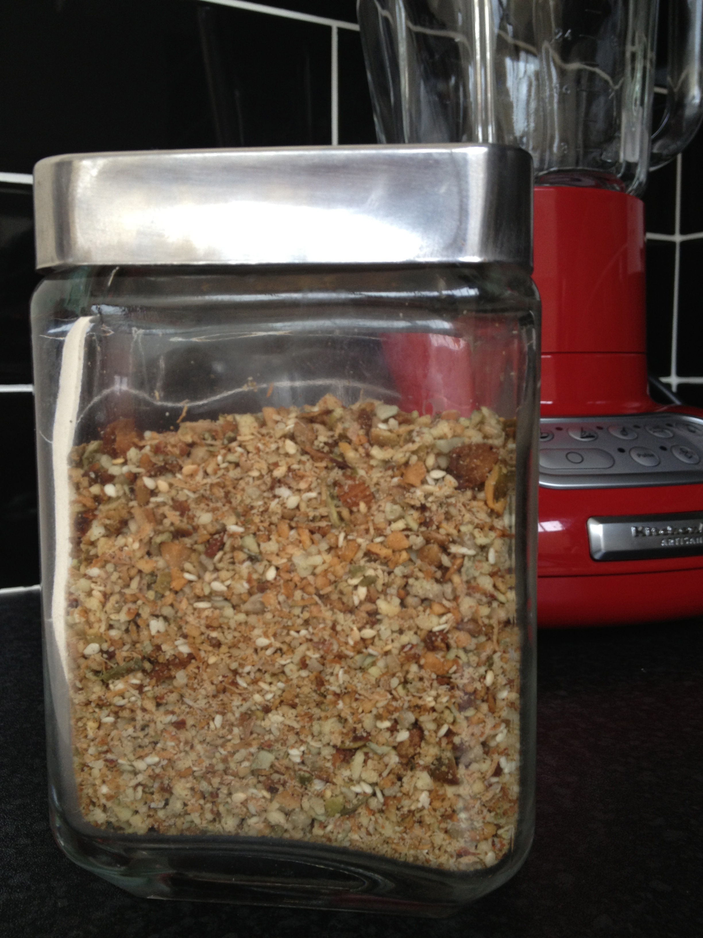 1. Deeeelicious. I always enjoyed granola for the crunch (check!) and the cinnamon/nutmeg combo of flavours (check!). This would be lovely with a grated Granny Smith apple. I am having the leftovers in a cauliflower and broccoli soup with a similar warm spice mix… Thanks for sharing!