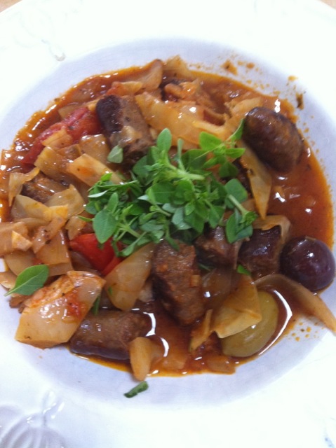 Talking of merguez (Moroccan lamb sausages) here is one I whipped up earlier. Few months ago I was talking to the lady in the title of this dish 🙂 and she mentioned that she had made a yummy dish with cabbage and merguez. I actually never got the recipe from her, but I thought: ok – got the cabbage, got the sausages, so what’s to stop me! and here is the product. Although to tell the truth where I come from this is a very common dish but it is cooked with smoked pork ribs.