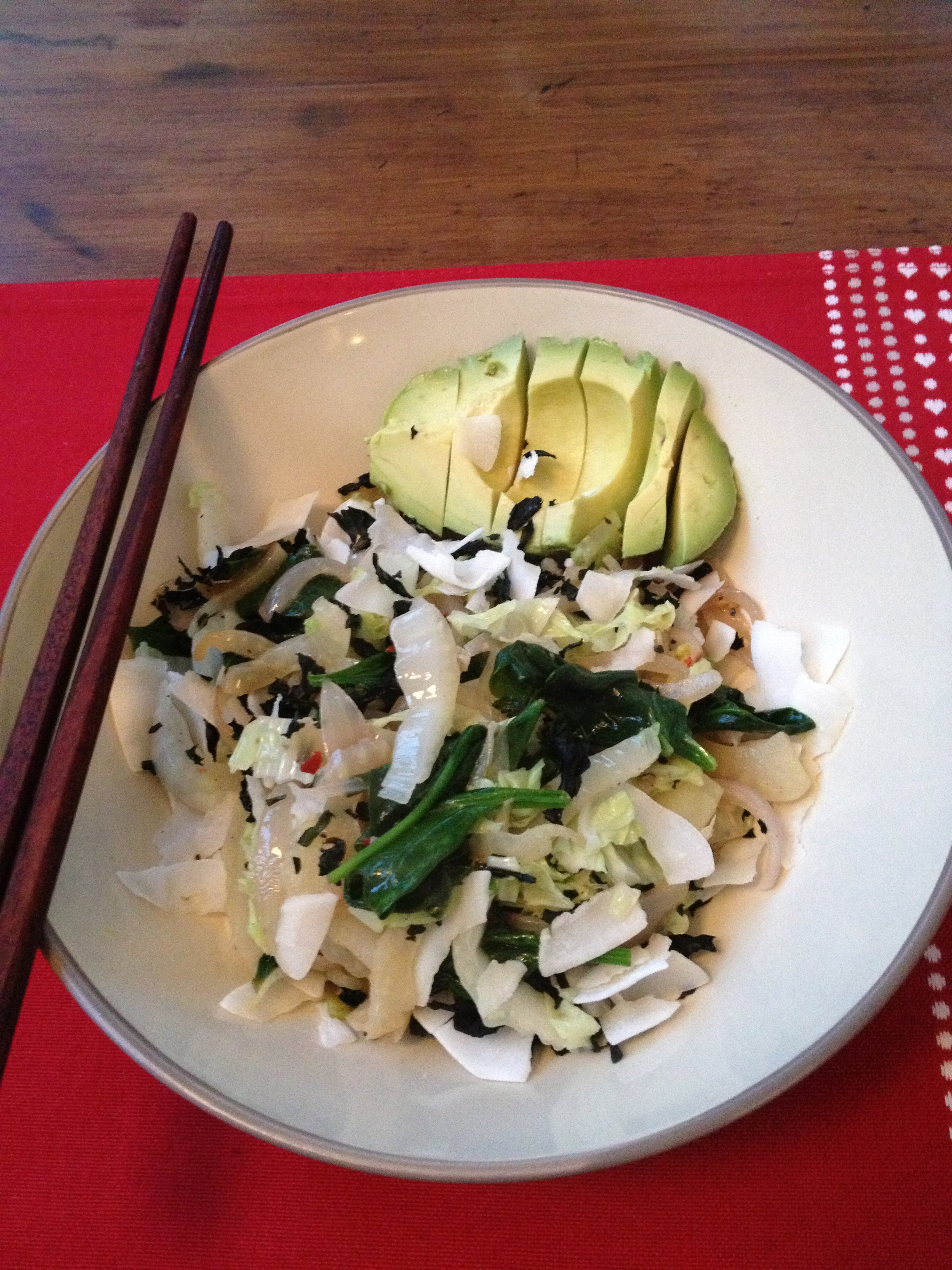 It is served here with wakame sprinkles, shredded coconut and half an avocado.