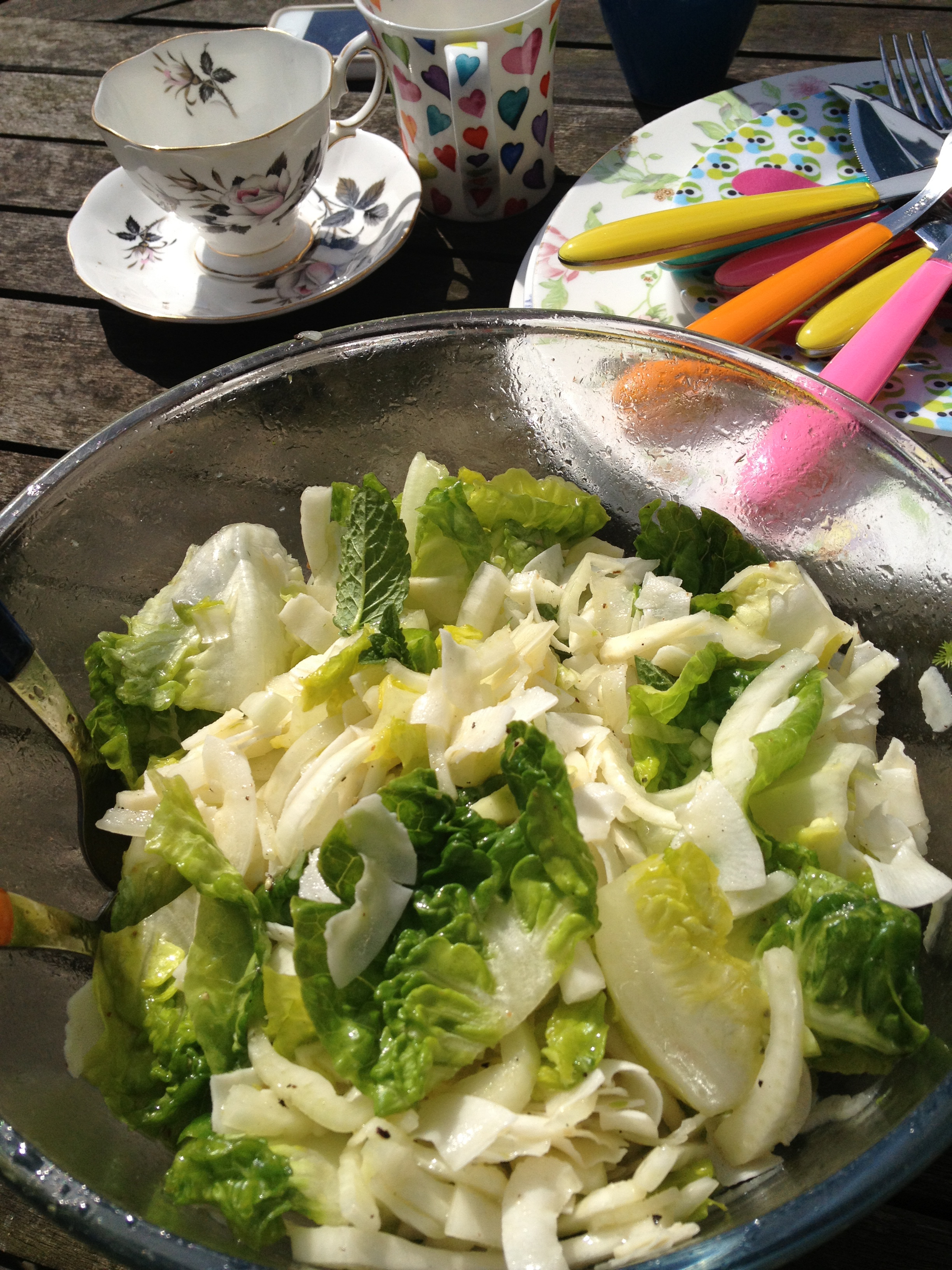 In a large bowl toss together finely sliced fennel, baby gem or cos lettuce leaves with lots of shredded coconut and fresh mint leaves.