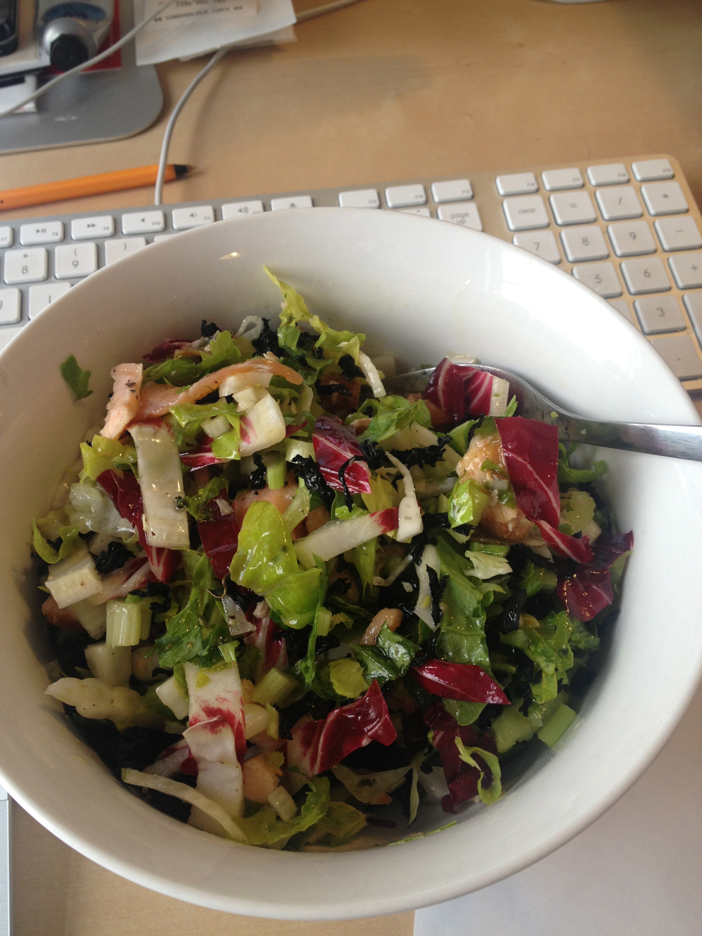 I finely sliced fennel, radicchio, celery leaves and cos lettuce, sliced the succulent salmon and dressed with cracked black pepper, lemon juice and olive oil.