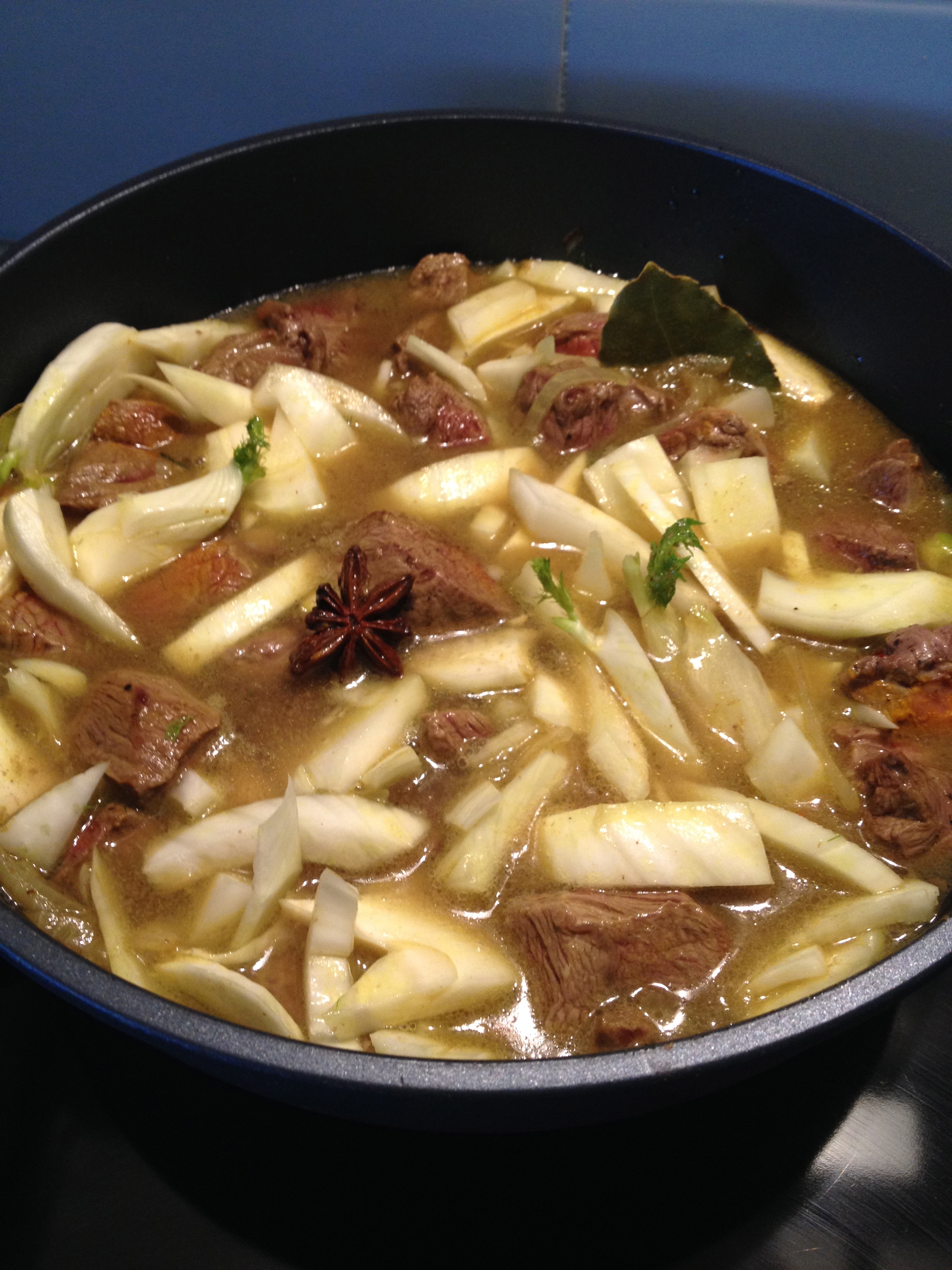 Cover and turn up to high, bring to the boil. Then turn to low and simmer for two hours, stirring occasionally.