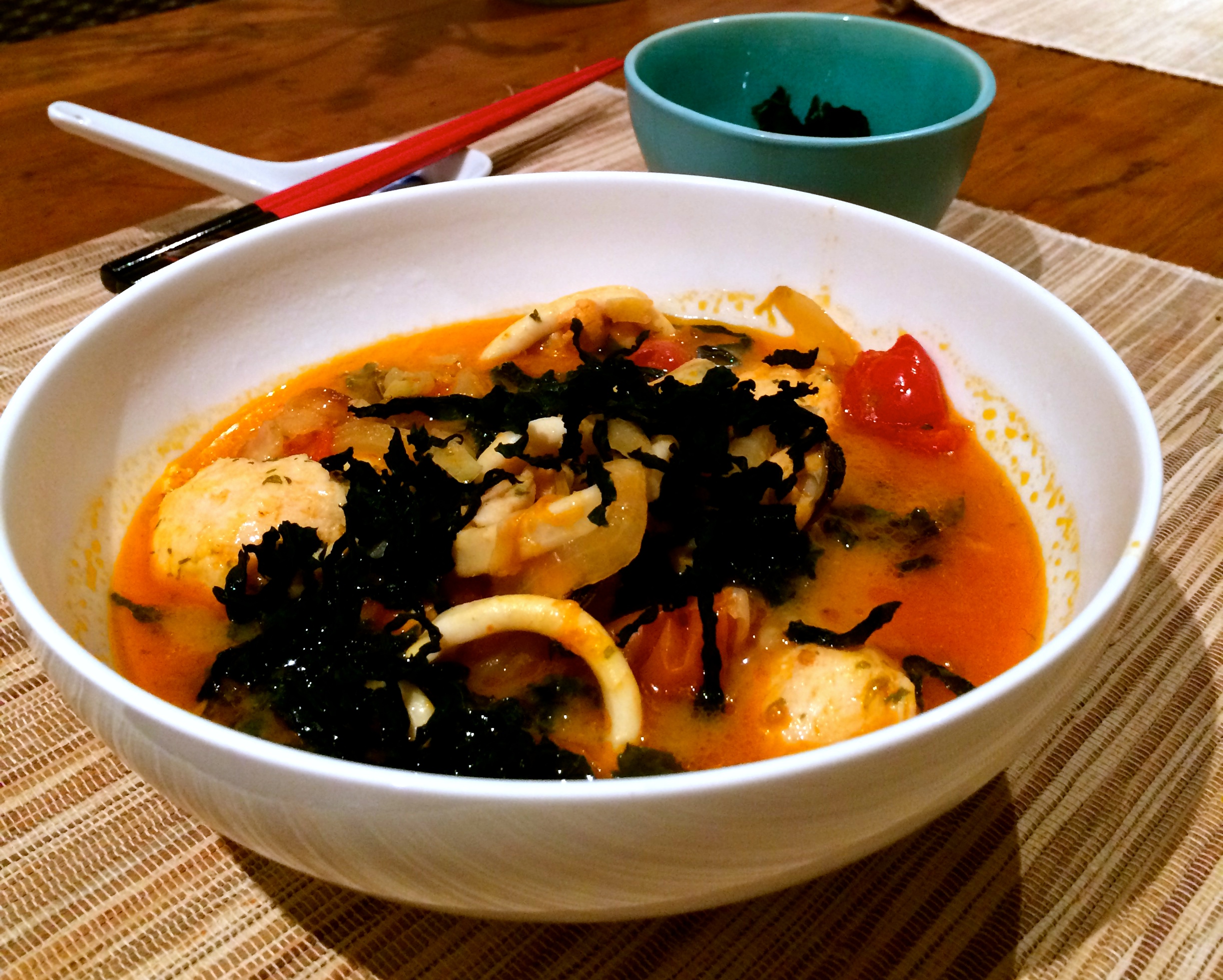 Add the fresh seafood – white fish, mussels, calamari, prawns – return the lid and bring to the boil. As soon as it’s boiling, turn off the heat and leave for 5 minutes.