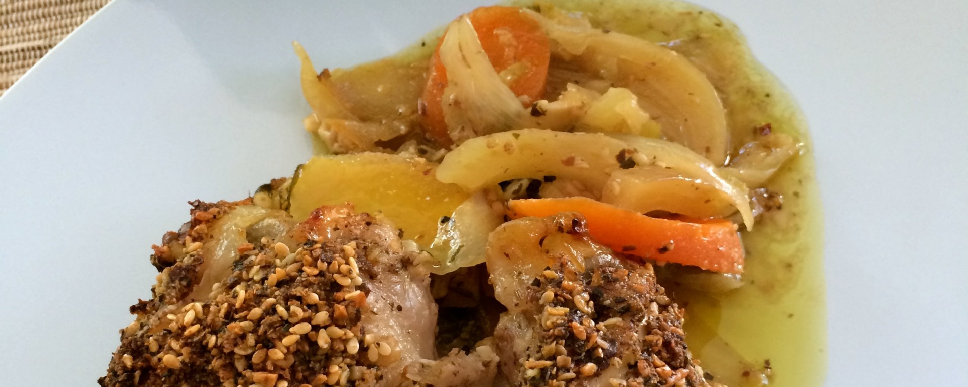 Fill a medium bowl with dukkah and the remaining olive oil and gently press the chicken pieces in the dukkah. I used thighs with the bone in and the skin left on so it retains moisture. This would be a beautiful recipe with chicken legs too!