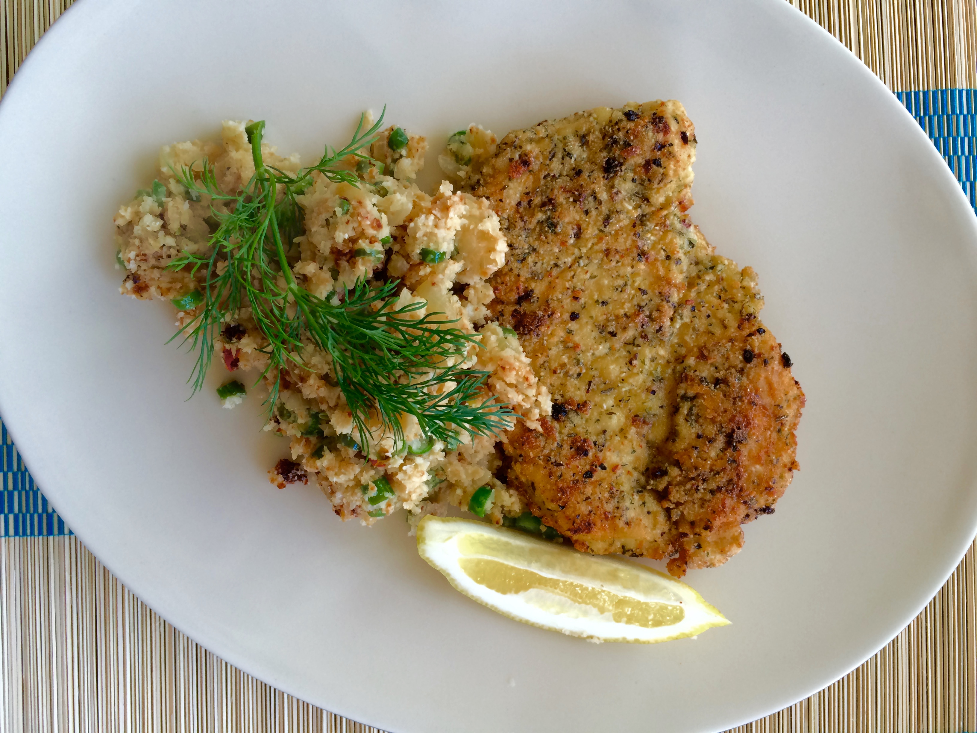 This is the first ever chicken schnitzel I’ve made and it knocked my socks off – sensational is an understatement – and a meal for four with this beautiful cauliflower fried ‘rice’ was about $4 per person. Beautiful nutritional meal on a budget!