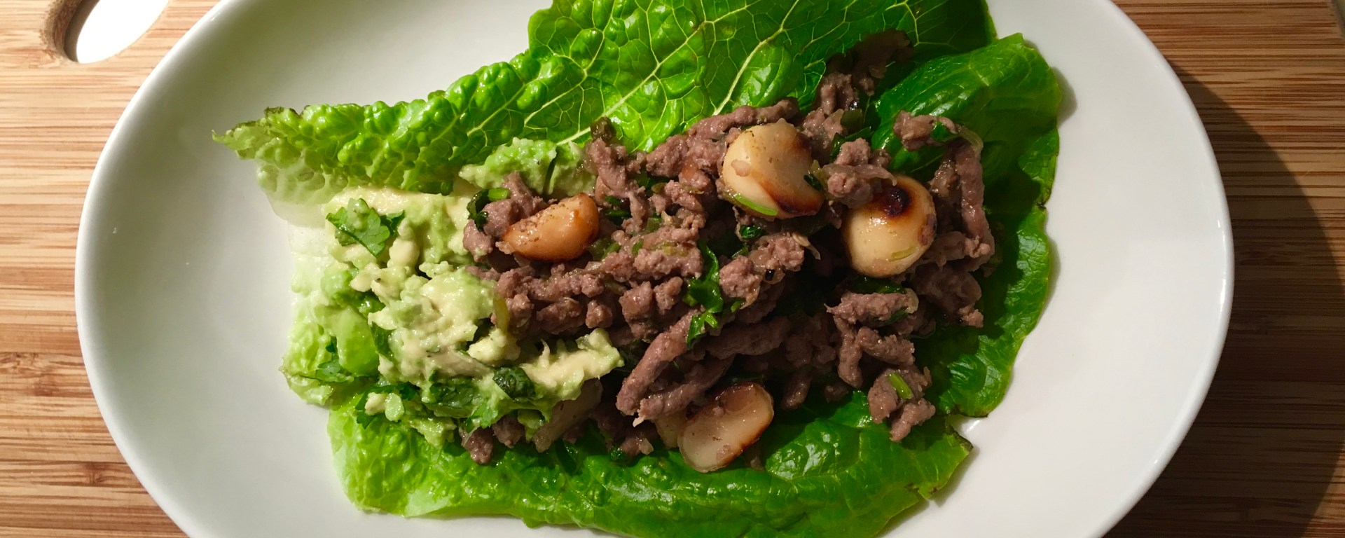 Add minced lamb, garlic, macadamia and halepeno to the onion and mix so everything is well combined and the lamb breaks up into small pieces. Allow to brown in the pan then add lime juice and rind and tamari and stir once. Allow the mixture to ‘catch’ on the bottom so the mince starts to get a little crispy and the nuts toast and brown. Stir once or twice then add the herbs, stir and then remove from the heat.