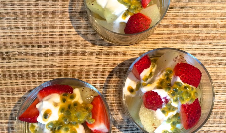 This is a treat that’s not too sweet … a little spicy and zingy with a swing and a tang .. kapow!! Ingredients: 2 large green Packham pears, firm 6 cardamon seeds, smashed open 1 star anise 1/2 teaspoon ground … Continue reading Spicy Poached Pears with Strawberries & Passionfruit